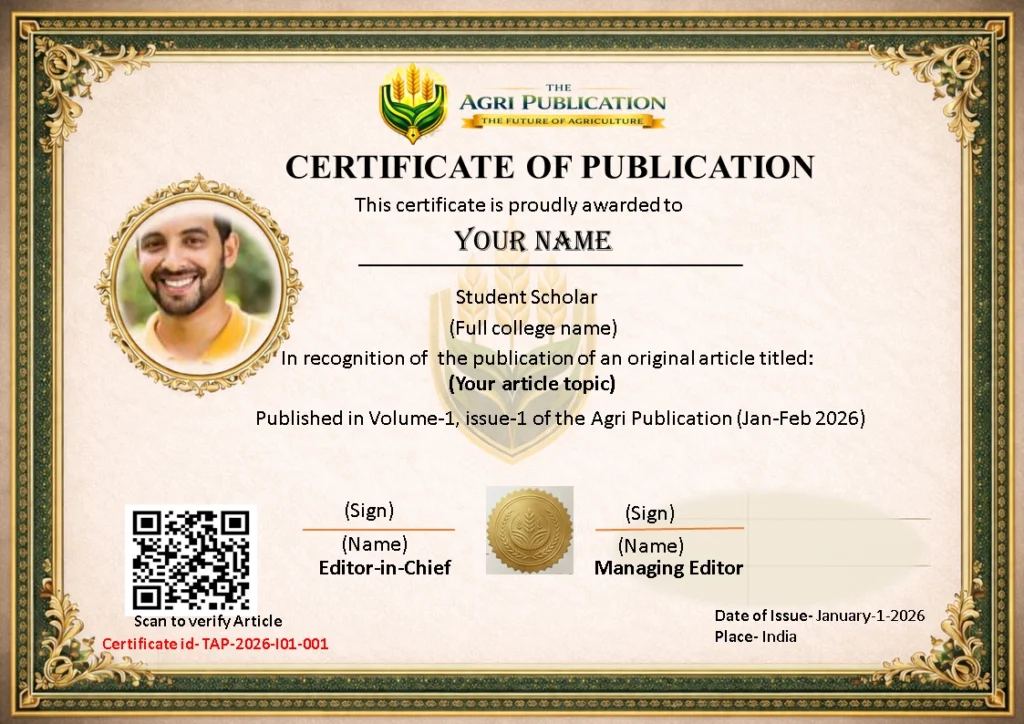 This is a sample of the publication certificate that students receive after their article is reviewed and approved. The certificate serves as academic recognition for your published work on our agriculture e-magazine